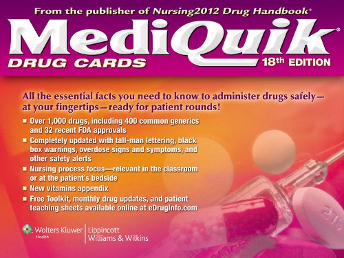 MediQuik Drug Cards, the card deck companion to Nursing2012 Drug Handbook, provides concise drug information in a handy 5" x 7" card format. Nursing students preparing for the NCLEX and practicing nurses who need a quick reference to specific drugs will find this deck a valuable tool. Boxed, with a plastic sleeve for carrying selected cards, the drug cards offer important drug information, including generic and trade names with pronunciations, indications and dosages, contraindications and cautions, and much more. This new edition features: